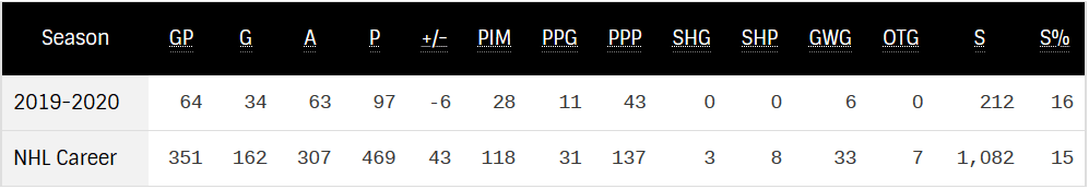 Another year, another dominant performance from #97. In case you’re wondering, McDavid’s points-per-game rate just trailed teammate Draisaitl’s on the season, and he was well on his way to a fourth straight 100-point season before COVID-19 shut us all down. I might shock you with my early conclusion here, but McDavid is a pretty good player and he’s going to go #1 or #2 overall in almost every 2020/21 fantasy hockey draft. The real question becomes what will he do in 2020/21 so we can value that versus Draisaitl et al.