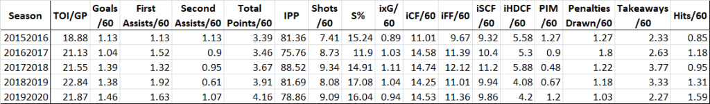 I like to start with individual points percentage (IPP) for a quick evaluation on how a player performed versus his career levels. We can see that McDavid was roughly inline with his 2018/19 levels (within 3%) but slightly lower. His shooting percentage was a percentage point lower than 2018/19 but still above his career average, while his individual chances for stats (ixG/iCF/iFF/iSCF/iHDCF) vary both positively and negatively which is a decent sign that he was much the same player in 2018/19 and 2019/20. The biggest change we can see here is an uptick in shots/60 from 8.08 to 9.09, but the latter mark looks more in line with his career rate (if we exclude his shortened rookie campaign) than his 2018/19 line. It’s also worth noting that he accomplished a very similar if not better statistical season while working with a minute less of ice time per game.