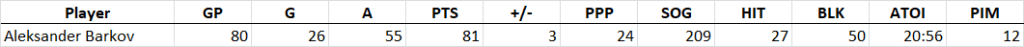 Aleksander Barkov has been touted as a pinnacle of two-way center prowess, a defensive specialist plus offensive dynamo in a single package in the vein of a Patrice Bergeron or Anze Kopitar. Barkov had a monster 2018/19 campaign, compiling 96 points in 82 games and putting himself close to the top of many lists like this one for 2019/20. But 2019/20 didn’t go according to plan for Barkov or the Panthers, and while there are some things we can point to, some things about Barkov’s season are downright puzzling. It was easy to predict a decrease in Barkov’s shooting percentage, but Barkov was on pace for more shots on goal and actually had a better season in terms of creating chances for himself and his teammates in 2019/20 than the year prior. The biggest glaring reason for Barkov’s drop in production was his utilization: his ice time decreased 2:21/game, a huge problem for any top-flight scoring threat. I can’t imagine the Panthers don’t go to the offseason and realize that their best chance for success involves playing Barkov at least at a 21-minute level, and I’ve projected him as such: