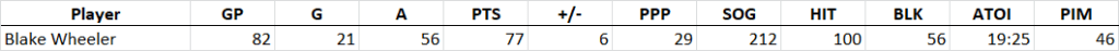 Blake Wheeler fits at #18 for me in 2020/21, a spot he’s consistently held down for five-plus years. He usually carries C & RW position eligibility which is nice flexibility in your lineup. Wheeler had back-to-back 91 point seasons before only managing 65 points last season in 71 games. He’ll be 34 before the new season starts and it’s hard not to wonder if this is the beginning of the end for Wheeler. Having said that, Wheeler posted individual and team chances for rates that closely mirrored his established levels. The biggest difference is that Wheeler was only entrusted with 19:19 of ice time per game this year, significantly down from 20:42 in 2018/19. At that decreased level of usage it’s hard to envision Wheeler returning to 90+ points in 2020/21. While I don’t see any signs of a diminishing player in Wheeler’s underlying stats, I project him to come in just under a point-per-game in 2020/21: