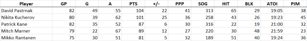 Rantanen gets the bottom rung due to the injury risk; if I could be assured of a full 82 games from him he would easily leapfrog Marner and possibly even Kane. Between Marner and Kane I would stick with Kane for the shot and goal production that you won’t find with Marner. Aside from that point, the two are very similar players. At the top I have Pastrnak inching ahead of Kucherov due to his goal-scoring prowess, but it’s easily the closest ranking between any two players in this top 5, and you could easily make the argument to stick with Kucherov at the top of your draft due to the aforementioned three straight 100-point paces.