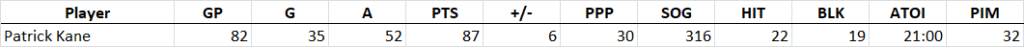 Patrick Kane get my #3 billing after yet another top-10 scoring performance. However, the way he got there does give some cause for concern. Kane posted a career high 84.9% IPP mark in 2019/20, and his on-ice chances for/60 declined for a second straight season. Kane is still an elite player and his rates compare favorably with just about everyone despite the decline; however he will turn 32 early in the 2020/21 season and as the Blackhawks mature their younger forwards I’m sure they will look to ease Kane’s very heavy workload (21:20/game last season, down from 22:29 in 2018/19). Overall Kane is still a very safe option for 85+ points much like Marner, but that 100-point upside may already be in the past. Kane does provide a ton of shots and goal-scoring ability which keeps him near the top of this list. If you want to read more about Kane you can find my full article on him here.