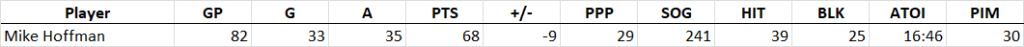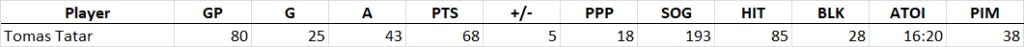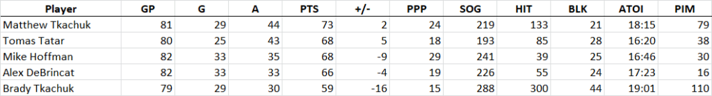 Brady Tkachuk has the lowest offensive upside of this group due to his lack of top-flight teammates, but as mentioned above if your league tracks two or three of the shots, hits, and PIM categories he catapults way up this list. DeBrincat, Hoffman, and Tatar represent another tier to me, not an easy group to delineate. Hoffman and DeBrincat are projected for very similar point production, but Hoffman gets the edge due to PPP and shots. I rank Tatar just a little higher because his production could get into the 70+ point range if Julien finally decides he’d like to win a few more games and plays his top line more often. Matthew Tkachuk is a clear cut above the other four for me, a higher floor player in terms of point production and adding a bunch of hits and PIMs to boot.