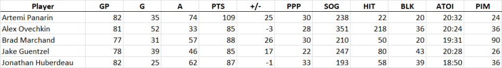 I put Huberdeau, Guentzel, and Marchand in a tier below the top 2 along with #6 & #7 Kyle Connor and Teuvo Teravainen. Huberdeau is unlikely to score 30 goals which limits his ranking, but his 92-point pace of the past two seasons keeps him above Connor and Teravainen. Guentzel has demonstrated that PPG pace over the past two seasons but carries monstrous upside skating with elite centers in Pittsburgh and should flirt with 40 goals. Marchand has scored 100 points and skates on what is likely the best line in the NHL which keeps him above the others in this tier even after a season in which his individual chance creation slipped a bit. Ovechkin and Panarin represent the top tier, Ovechkin for his unbelievable goal scoring along with shot and hit generation, and Panarin for the unparalleled point potential. I have Panarin projected to outscore the next closest LW by 21 points and that is an insane amount of extra production that cements his #1 status for me.