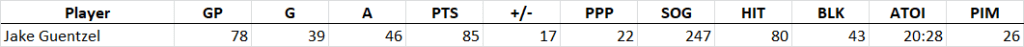 Jake Guentzel slots in at #4 for me after an injury-shortened 2019/20 campaign that saw him pace above a PPG for the first time in his career. Guentzel’s ice time climbed to a career high 20:37 per game, and impressively improved his shots/60 rate at the same time. Guentzel shot 15.75%, nearly a 2% decrease from 2018/19 – this is a player who will maintain a high shooting percentage, especially while he has the benefit of playing alongside one of Evgeni Malkin or Sidney Crosby on virtually every shift. Guentzel’s IPP remained unchanged from the 2018/19 season but his on-ice CF and xGF rates improved significantly. In short, all arrows are pointing upward for the 25-year-old and he should flirt with 40 goals and become a PPG player of the course of a full season in 2020/21.
