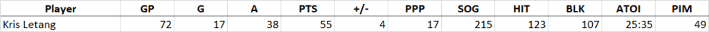 Torey Krug slots in at #12 in these rankings despite uncertainty over his UFA status. I personally believe there’s slim chance Krug signs anywhere other than Boston (even if only on a 1-year deal), and I have projected Krug as if he will remain the Bruins’ PP1 quarterback in 2020/21. This is a player with top 3 on-ice chances for and scoring chances for rates among all defensemen, and whether you believe that Krug is just that talented or he is a product of the Bruins’ potent offense, the fact is that when Krug is on the ice, the Bruins are generating chances and scoring goals. While Krug’s individual chances for rates have declined for two straight seasons, his IPP has remained consistent throughout the past four years. As long as he remains tied to the Boston power play, Krug will push 60 points a season.