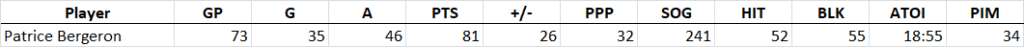 Patrice Bergeron is the first name on this list and is a player that I think doesn’t get enough respect for his offensive contributions. Bergeron is continually lauded for his defensive prowess and rightfully so, but that perception of him along with his age (entering his age-35 season) causes most to look elsewhere for their C2 slot. But let’s take a look at his shot rates: