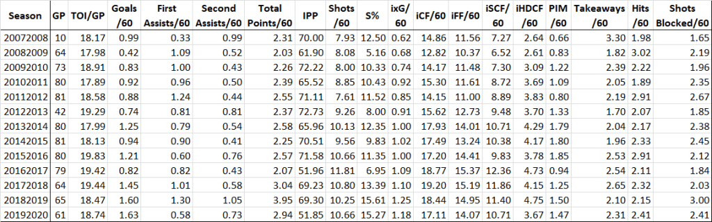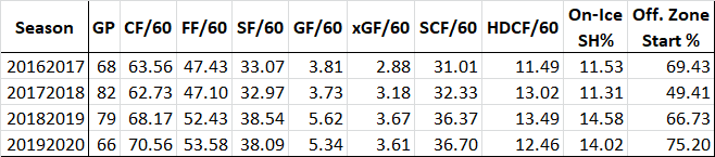 Consistency is the first word that comes to mind here. Looking at his last three seasons (in which he averaged a 94-point pace over 82 games), we see consistent usage, consistent IPP, a S% that can bounce around a bit but averages around the 16+ percent rate he fired in 19/20, an improved iCF/60 that ranked 4th among centers, and excellent scoring chance generation. Going into his on-ice team rates yields the same results: the variation over the last three seasons is minimal.