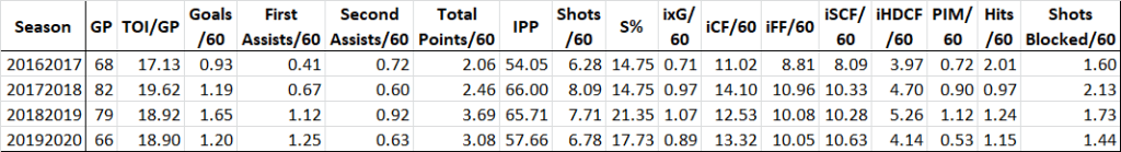 Brayden Point is another player that saw a surprising dip in IPP in 2019/20 and looks to be in line for a rebound season. Lots of fantasy managers will see his 2018/19 92-point campaign as a major aberration and consider him to be a 70-75 point player moving forward, which will create a value Point in your 2020/21 drafts (see what I did there). Let’s check out that IPP and some other rates: