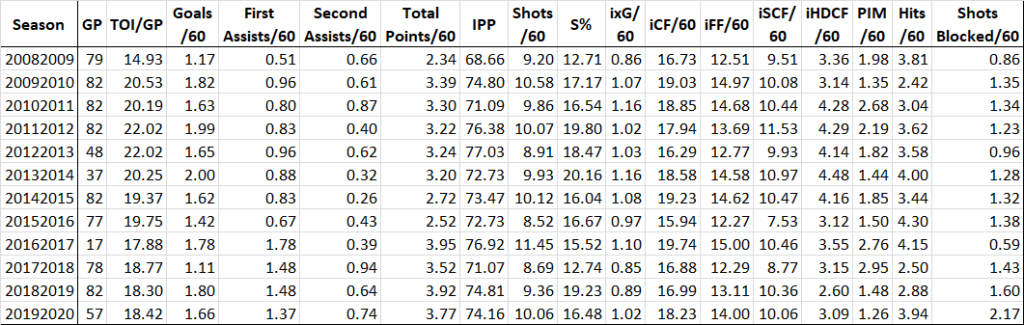 Starting with the IPP we see Point establish a level around 66% in two straight seasons (including his breakout 18/19) and then drop to 57.7% last year. That difference represents 9 points over his 66 GP; tell me we aren’t talking about Point in a very different light if he posted 73 points in 66 GP rather than 64. There are lots of other encouraging signs here as well: the drop in production can be partially attributed to a lack of secondary assists while Point actually had more primary assists/60 in 19/20 than 18/19. The goal rate was bound to come down after that outlandish 21% S% he posted in 18/19, but the fact that he sustained a 17.7% rate in 19/20 tells us that this is a player who can support a high shooting percentage. He also saw a minor improvement in iCF/60 and maintained an iSCF/60 rate that ranked 7th among NHL centers. On the team rate side there’s nothing to suggest Point’s play fell off in 2019/20 and we can feel pretty confident that he’s in line for some positive regression next year as an integral part of that elite Tampa offense.