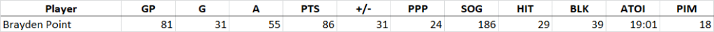 Point’s teammate and captain Steven Stamkos is the last of the centers we’re looking at today, and to me represents a tremendous value as a bankable point producer. This is a guy who is 6th in points/60 over the past three years, sandwiched in between David Pastrnak and Nathan Mackinnon. Let’s get after it: