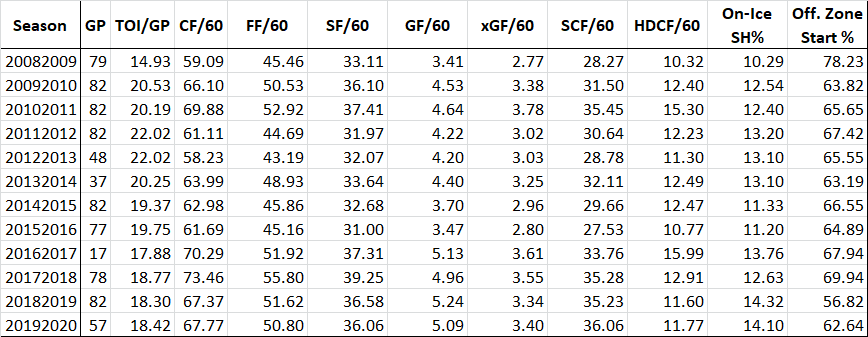Let’s start with the individual stats. Bergeron’s iCF/60 has declined in two straight years, usually a bad sign for a player entering the second half of his 30s. But it’s important to relate this level of production to the rest of the league – Bergeron’s 17.11 iCF/60 ranked 9th among NHL centers in 2019/20, ahead of fantasy darlings like Mika Zibanejad, Evgeni Malkin, and Jack Eichel. Now Bergeron doesn’t see the same amount of ice time as those guys so the raw totals won’t be as high, but the production is there. Bergeron could lose another full point off his iCF/60 and still rank top-15 in the league with ease. Bergeron’s S% has ranged from 13.4 to 15.6% over the past three seasons, so even if he drops to the lower end of that range he’s scoring at a great clip. And then there’s that IPP. Bergeron’s IPP took an inexplicable 17% nose dive in 19/20. Bergeron had a similar bad luck season in 2016/17 and his points/60 took a 50% jump the following year. We’re talking about 18 more points Bergeron would have scored (in just 61 games) if his IPP had stayed at his established career rate. We can see from Bergeron’s on-ice stats that Boston as a team played at pretty much the same rate with him on the ice in 19/20 as it did in 18/19.