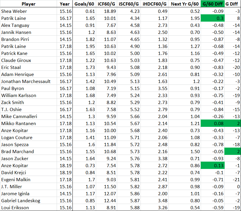 Hello everybody and welcome in for another article. I’ve been taking some time to put together what I hope you’ll agree is some quality content and information that you likely have not encountered elsewhere. I’m trying to tackle the problem of goal scoring regression and learning what statistics may predict an impending decline in that area. If you want to check out my first article on the topic you can find that here. I began my analysis for this article with a hypothesis that players that do not generate many individual scoring chances for relative to their actual goal scoring output would regress in the following season. I went back five years and compiled the following list of players who scored more than 20 goals while having an iSCF (individual scoring chances for) per goal rate less than 6.00: