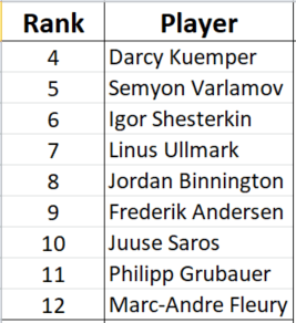 Higher positional value at position with an extreme amount of variance should push us away from mid round picks, not towards them. Think of it this way: if your 6th round goalie has a 50% chance of flopping (which is what the data suggest is roughly the case), that flop will hurt you much more than his performance exceeding his draft position will gain for you. Players like Kris Letang and Mark Stone got drafted in my sixth rounds last year, while goalies like Carter Hart and Tristan Jarry went ahead of them. The higher the draft pick, the less variance you want. If you spend a high draft pick or two on a goalie and they bomb their season, your season is over. If you don’t, you can likely get at the very least league average play from late round and waiver wire goalies and it only takes one “hit” to put you in the upper echelon of goaltending play in your league. The floor for every goalie in the league except maybe Vasilevskiy, Connor Hellebuyck, and Robin Lehner is “actively hurts your fantasy team”.