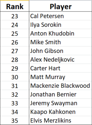 This is the tier that I think gets people into trouble the most often. People will go into this season thinking they’re safe with Darcy Kuemper or Igor Shesterkin or Semyon Varlamov and they will simply get outproduced by goalies drafted 100 picks later or even plucked off of waivers after the season has already started. Investing high draft capital into Carter Hart or Jacob Markstrom last year was a huge problem because you likely didn’t cut them loose for the majority of the season despite them actively hurting your team relative to league average play. And that’s not even factoring in the missed opportunity cost of taking that goalie instead of taking a season-long contributing piece at forward or defense! One more thing that works against taking starters in this tier: goalie performance varies wildly throughout the season and the best way to react to that variance is to ride it rather than pull against it.