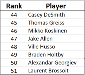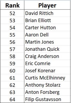 Here we’re solidly into backups and other goalies with lots of question marks on talent (Bobrovsky) or situation (Reimer, Hill). I’m not super interested in these guys, but in a standard 12-team league you’re probably not scraping the bottom of the barrel for these guys anyways. In leagues that reward volume I’m obviously leaning toward Bobrovsky, Reimer, and Hill, while in leagues that reward better rate stats I’m more interested in Raanta and Driedger.