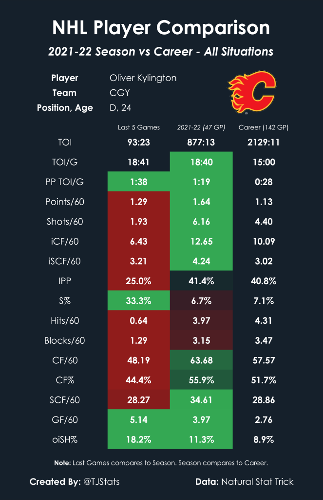 Kylington was one of the biggest stories of the early going this season, scoring 12 points in 12 games at one point and ripping off 5 different 3+ game point streaks. Unfortunately Kylington’s last point streak (a five game run this time) was preceded by eight pointless games and he’s now gone four straight without a point again as of this writing. Unfortunately some of that is due to Kylington’s performance: across his last five games every statistic I like to look at for point-scoring defensemen has dipped sharply, from individual Corsi For/60 (iCF/60) to on-ice Corsi For/60 (CF/60) and on-ice scoring chances for/60 (SCF/60). I think Kylington has real talent and is likely to be a fantasy relevant defenseman in future years. But unless you’re really scraping the bottom of the barrel in a points league, I think you can probably do better on the waiver wire than Kylington at this point.