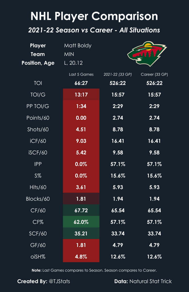 Boldy’s season has taken a hard right turn of late, getting bumped off the top PP unit and seeing his minutes decrease to the point that he’s averaging just 13:17 in his last five games. The shots and iSCF have dried up as well despite his on-ice stats still looking very solid. Linemate Kevin Fiala can carry a line, but Boldy will need to get back to his previous level of play to be fantasy relevant. If you’re still carrying Boldy it’s beyond time to drop him. This is a point I often bring up about rookies: they’re wildly unpredictable. They don’t have the reps in the league to understand yet what to do to bust a slump and get their game back on track. I still think Boldy has a bright future in the league, but I will wait to see his chance generation numbers bump back up before I think about adding him back on my rosters.