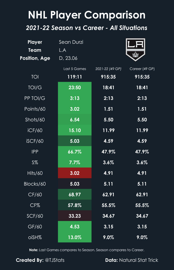 Durzi is a guy I’ve been pumping up a bit for over a week at this point. He’s replaced Drew Doughty as the Kings’ top defenseman and is absolutely crushing the role. His 15.1 individual Corsi For/60 (iCF/60) over the past five games ranks 17th among all defensemen during that span, made even more impressive by the 23:50 ATOI he’s been logging. The Kings have been trending well of late and Durzi’s on-ice CF/60 reflects that too. Undoubtedly the individual points percentage (IPP) and on-ice shooting percentage (oiSH%) are a bit too hot and he won’t continue with multi-point games all over the place, but Durzi provides shots, blocks, and a few hits to boot. That kind of multi-category coverage makes Durzi a dream for fantasy managers everywhere.