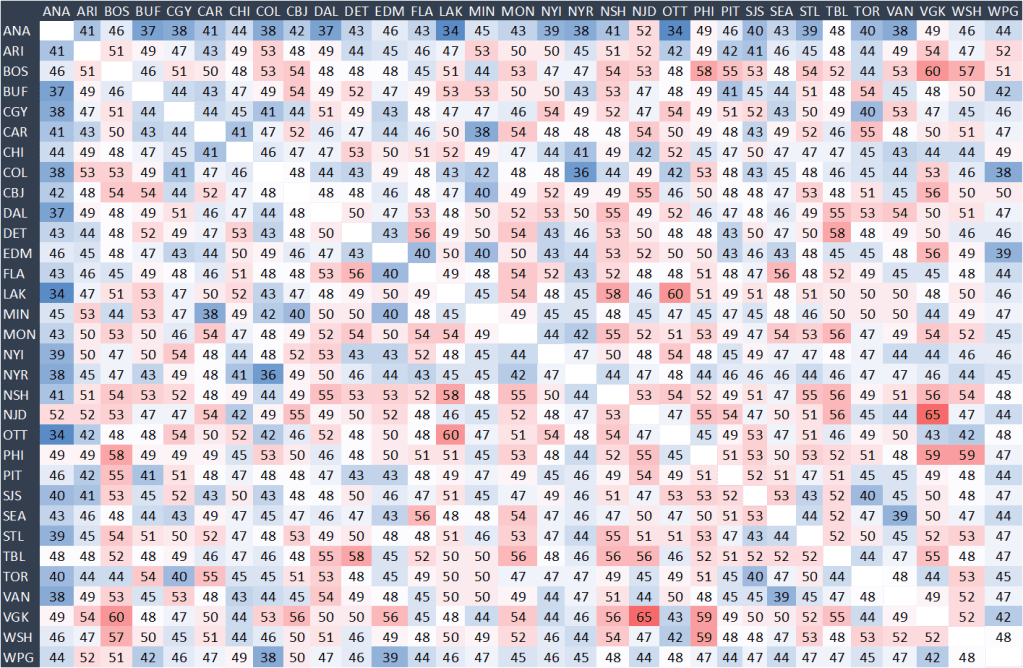 Note that using a matrix like the one above is better than simply relying on how many games a skater will play on “off nights” (an “off night” could be defined in different ways, but a common definition is any day on which no more than half of the teams in the NHL are playing). For example, Anaheim has the most off nights of any team in the NHL, but using the above matrix shows that simply relying on off nights can be a trap if you assume that you can stack skaters from Anaheim and New Jersey.