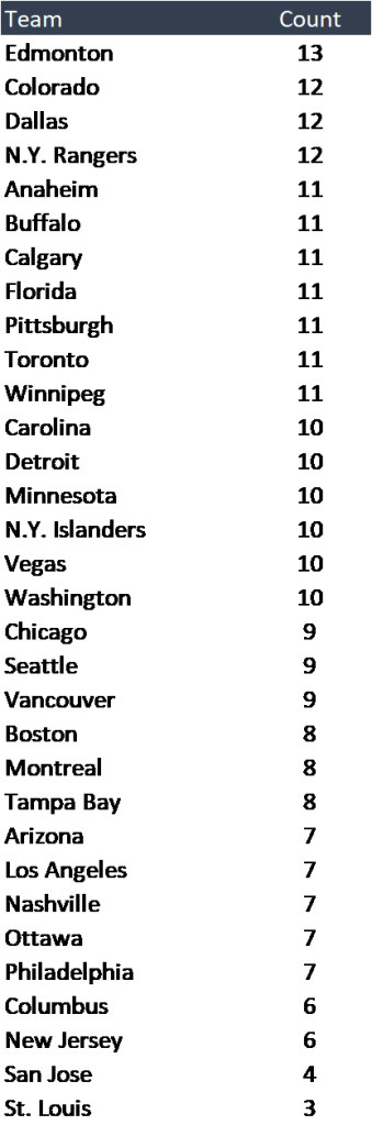 Assuming you don’t have a model to tell you which skaters are the best fit for your team, you can make an informed guess by using a matrix that shows how many times two teams play on the same night (this is copied from my fantasy point projections which are available to the public at patreon.com/18skaters):