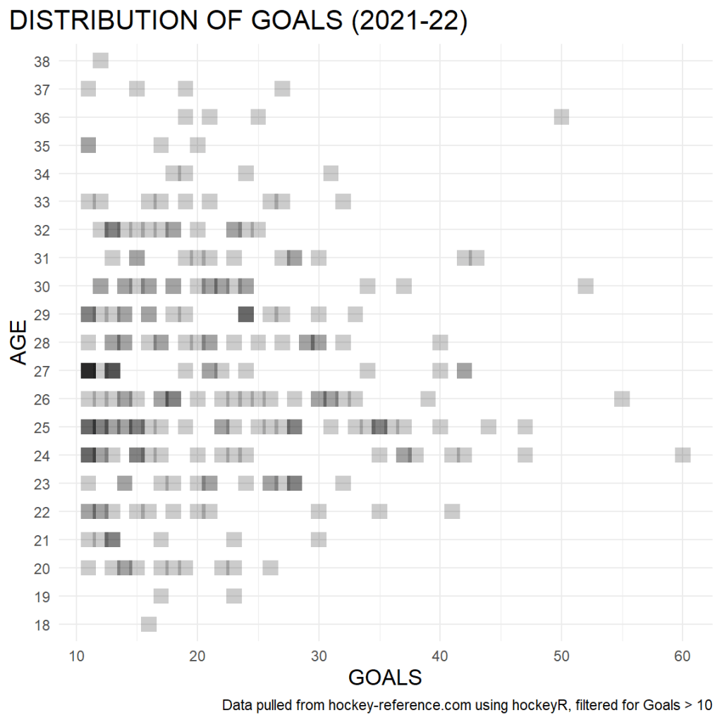 The goals data from last season are plotted below. Each square in the plot represents a skater, and its location shows the skater’s age and the number of goals he scored. The squares will overlap when skaters who are the same age score the same number of goals. When that happens the squares get darker, and the effect is essentially a “heatmap” where the dark areas represent the highest density of skaters.