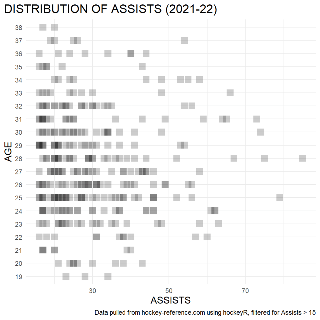 The assists data from last season are plotted below. Each square in the plot represents a skater, and its location shows the skater’s age as well as his assists for the season. The squares will overlap when skaters who are the same age register the same number of assists, and when that happens the squares get darker. The effect is essentially a “heatmap” where the dark areas represent the highest density of skaters.