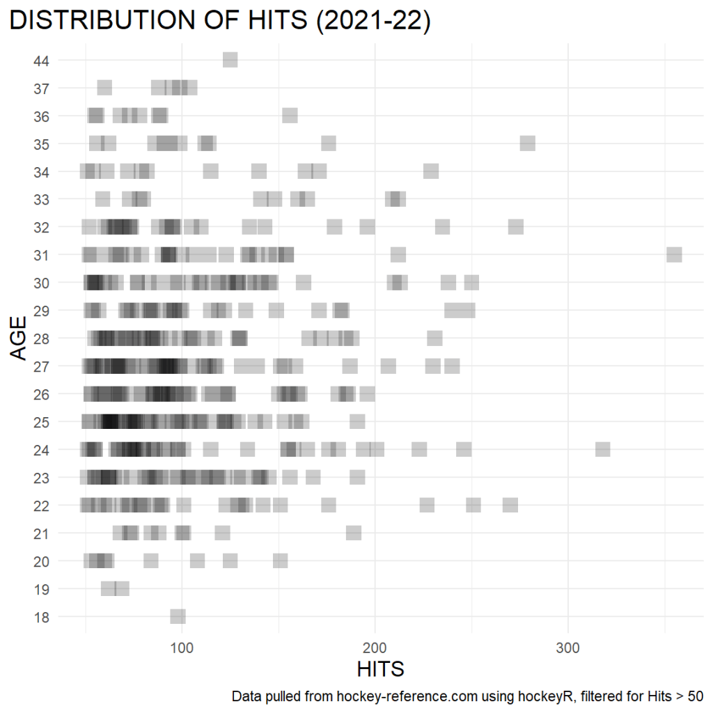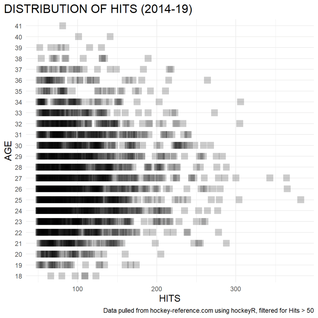 The hits data from last season are plotted below. Each square in the plot represents a skater, and its location shows the skater’s age as well as his total hits for the season. The squares will overlap when skaters who are the same age register the same number of hits, and when that happens the squares get darker. The effect is essentially a “heatmap” where the dark areas represent the highest density of skaters.