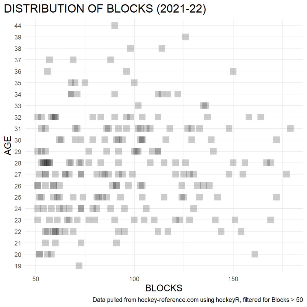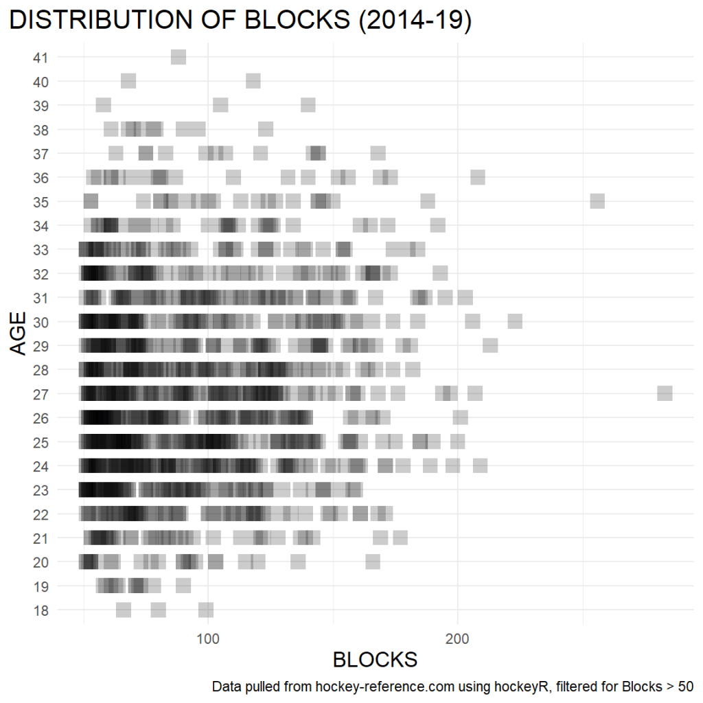 Maybe scatter plots that look like heatmaps aren’t your thing. Perhaps you want some simple numbers that tell you what’s going on here. OK, here’s a count of the number of skaters who had at least 150 blocks in a season, separated by age.AGE DISTRIBUTION OF 150+ BLOCKS