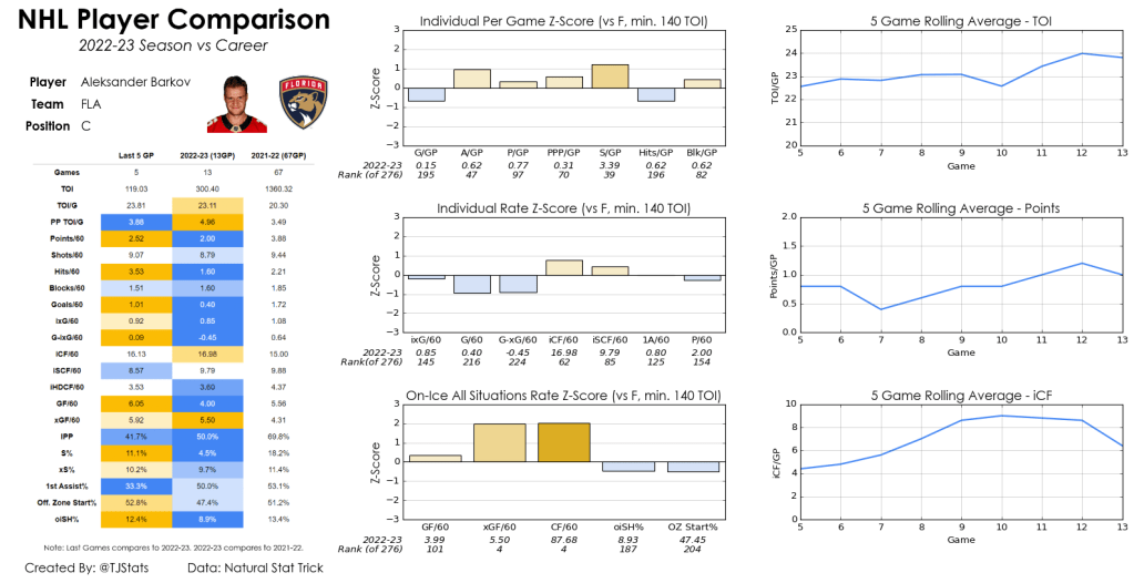 I’ve got absolutely no worries about Barkov. He’s actually been producing just fine of late, too: six points in his last six games. He’s averaging four shots per game across those games and more than four iSCF per game. The extra work I posited as a possibility under Paul Maurice back in July has come to pass in a big way: Barkov is averaging 23:06 per game, nearly three minutes per game more than the 20:18 he played last year. For him to have not given much back on the shots/60 and holding steady in iSCF/60 is actually quite remarkable, and really any lack in Barkov’s production is due to a 50% individual points percentage (IPP) and 4.6% shooting percentage (S%) more than anything he’s not doing. In fact, Barkov’s on-ice rate stats are astronomical currently, blowing last year’s terrific season out of the water (87.7 Corsi For/60 vs 71.2 last year, 48.7 scoring chances for/60 vs 39.6 last year). If there’s any sort of buy-low opportunity now with Barkov you’d best jump on that immediately.