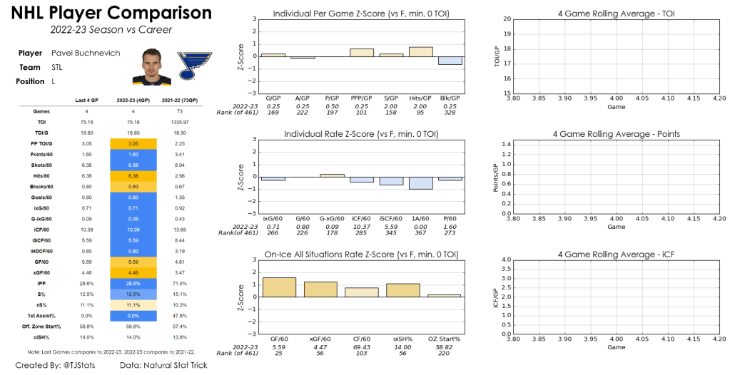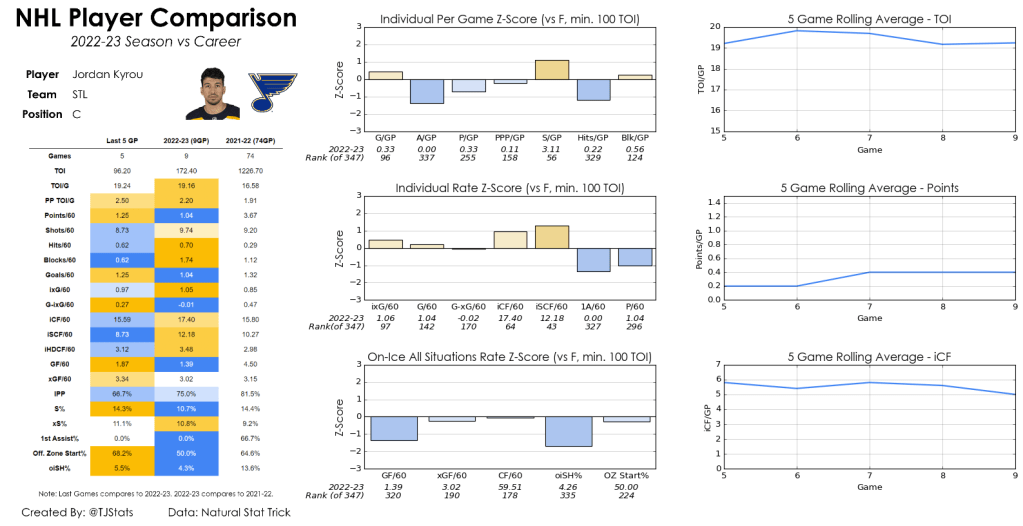 There was a lot of interest in the Discord in a broader discussion on the Blues, so I’ve got three players here for you who I’ve heard lots of talk about dropping. First off, let me just say that the Blues have been dreadful at even strength, ranking 28th in CF/60 and 23rd in SCF/60. Their 6.7% team shooting percentage at even strength is worst in the league and due for some regression, but unless they find a way to generate more shots on goal it’s hard to envision them becoming a top-half offense in the league anytime soon. Luckily the power play is still a top-half unit, but that’s not enough.