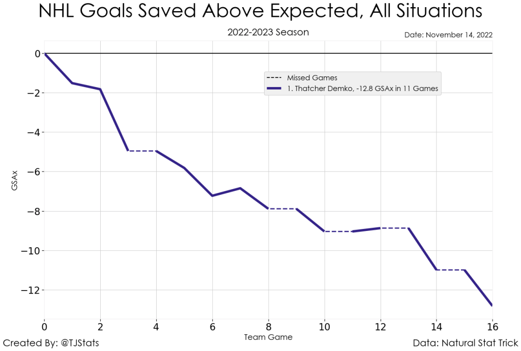 Ah yes, my favourite activity: predicting goalie performance. If this season hasn’t sold you on #ZeroG as a draft strategy yet I’m not really sure what will. I will say that Demko has fared a little better than I would have thought at even strength this year given the discourse around his play (a .907 even strength save percentage). Demko’s penalty kill save percentage currently sits at .689, which for reference would have been the worst PK save percentage among all goalies to play at least 100 penalty kill minutes last year (55 in total). And it would have been the worst by a full 100 basis points. So while Vancouver is certainly not playing well there is at least some hope that Boudreau gets fired and a new coach installs a penalty kill that doesn’t get absolutely lambasted by every team that the Canucks play. I’m not going to tell you that Demko is going to go back to a .915 save percentage goaltender again, but he’s certainly more than the current .874 iteration of himself.
