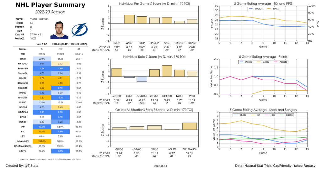 Here’s one development no one saw coming a week ago: Victor Hedman has been bumped off the top power play unit in Tampa in favour of the newer model in Mikhail Sergachev. Hedman has gone pointless in three straight and some are wondering if they should be looking to move off Hedman. For a guy that I projected to put up 34 power play points to lose his power play role is certainly concerning; at best you’d predict a 12-15 PPP pace for Hedman while he’s not on the top unit. Not many defensemen can sustain a 20ish point decrease in their point projection and Hedman is no exception. I still think it’s more than likely that Hedman gets that PP1 role back at some point, but if you can exit Hedman now for full price via trade, I don’t mind mitigating risk in that way.
