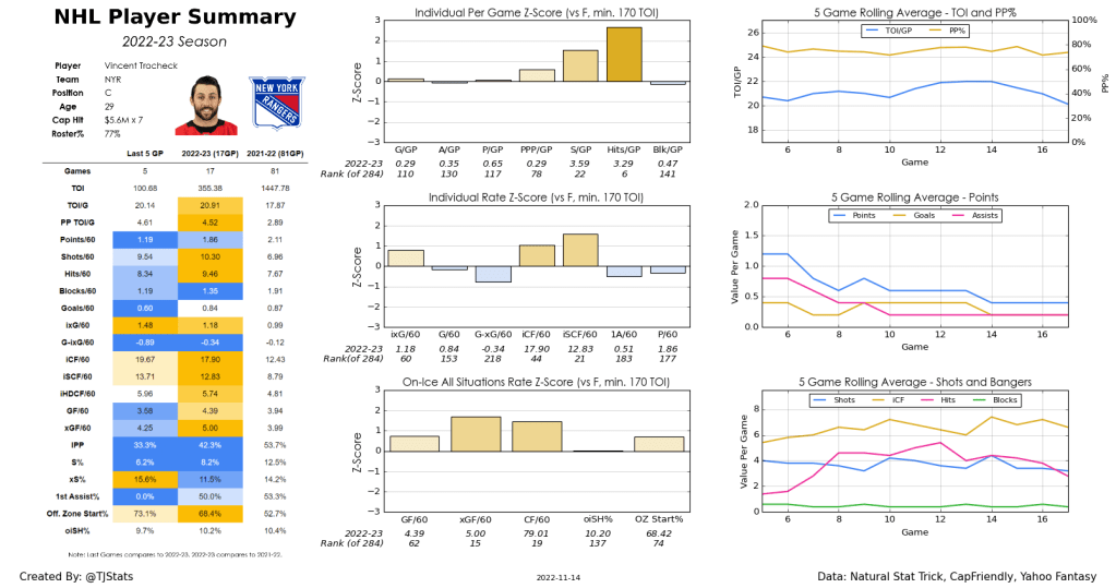 You can be excused for getting a little nervous about Vincent Trocheck these days, as Trocheck has only scored points in two of his last twelve games (although he scored three in one of them and two in the other). The good news here is that nothing looks significantly out of place for Trocheck in his recent stats. He’s averaging nearly 5 iSCF/game in his last five games, and while the actual shots on goal haven’t been at quite the same level I don’t have major concerns for Trocheck’s ability to turn chances into shots and shots into goals moving forward. The on-ice numbers still look just fine, and Trocheck is still skating 20+ minutes per game. If there’s a buy-low window here with Trocheck I’m all about it.