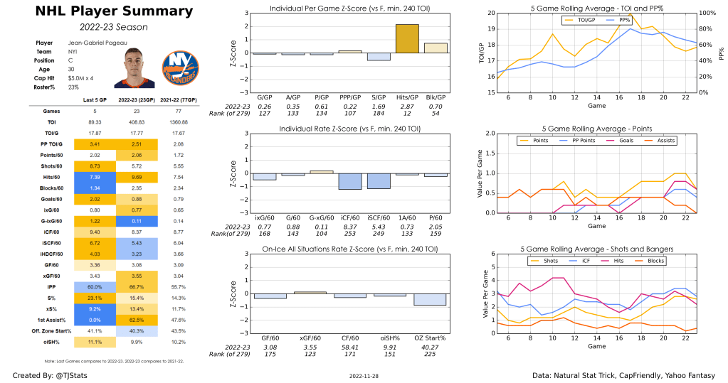 Pageau is a tough nut to crack, scoring three goals in his last five game but juxtaposing two five-shot games with three one-shot games in that stretch. His feast-or-famine point-scoring nature makes him a difficult study for us as managers. The bonus with JGP is that he’s a consistent hitter, giving him bangers cats value even when he’s not producing points. At the same time, we need to be realistic with our expectations here: Pageau has never scored more than 43 points in a season before and a 50-point season should be considered a win. If that’s below the line of demarcation in your league then you can safely stream Pageau out for the next player with a great schedule. Pageau’s on-ice context has improved with the Islanders’ coaching change, but there’s nothing in his individual numbers that suggests he’s taking another step at age 30.
