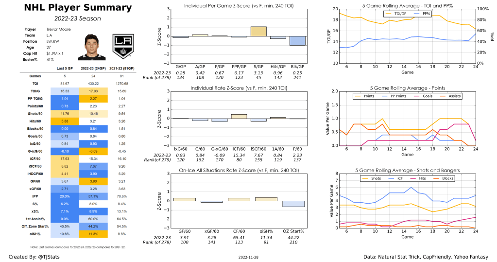 Doughty has been an unmitigated disappointment this season with just 12 points in 24 games. Doughty is still seeing his customary 26 minutes a game, but his shot rates have dipped significantly thus far and his on-ice numbers have taken a hit as well. It’s not all doom and gloom with Doughty however as he should see a significant bounceback in his S% and lesser positive regressions in IPP and oiSH% that should see him return to a 50-55 point pace at minimum. But there is certainly concern that Doughty’s perceived ceiling as a 60-point defenseman may not be in the cards this season unless something changes in the near future. I tend to think that there’s still some hope for that to happen, but unfortunately that’s all it is at this point: hope.