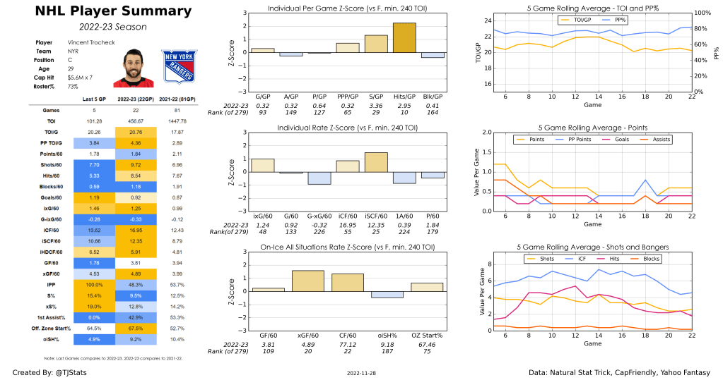 Trocheck has had a very up and down season so far, starting out with his tail on fire and then only scoring points in four of his last seventeen games (no, seriously). Trocheck’s last three games before Monday’s game against the New Jersey Devils were very uninspired, with just five shots and four individual scoring chances for (iSCF) between them. On the season, Trocheck still looks like he’s been generally unlucky. You could see a boost in the individual points percentage (IPP), shooting percentage (S%), and on-ice shooting percentage (oiSH%) all coming based on his career numbers. Unfortunately now we have to question Trocheck’s deployment as he’s been dropped to the third line and Filip Chytil has been elevated in his spot. My thesis on Trocheck is pretty simple: he was paid a lot of money to be Artemi Panarin’s center and he will play the vast majority of his games there. The Rangers as a team have been scuffling of late and Trocheck is not immune to that. On the season, I still view Trocheck as a 65-70 point pace player and I’d be willing to “buy low” on him if his current manager has had enough.