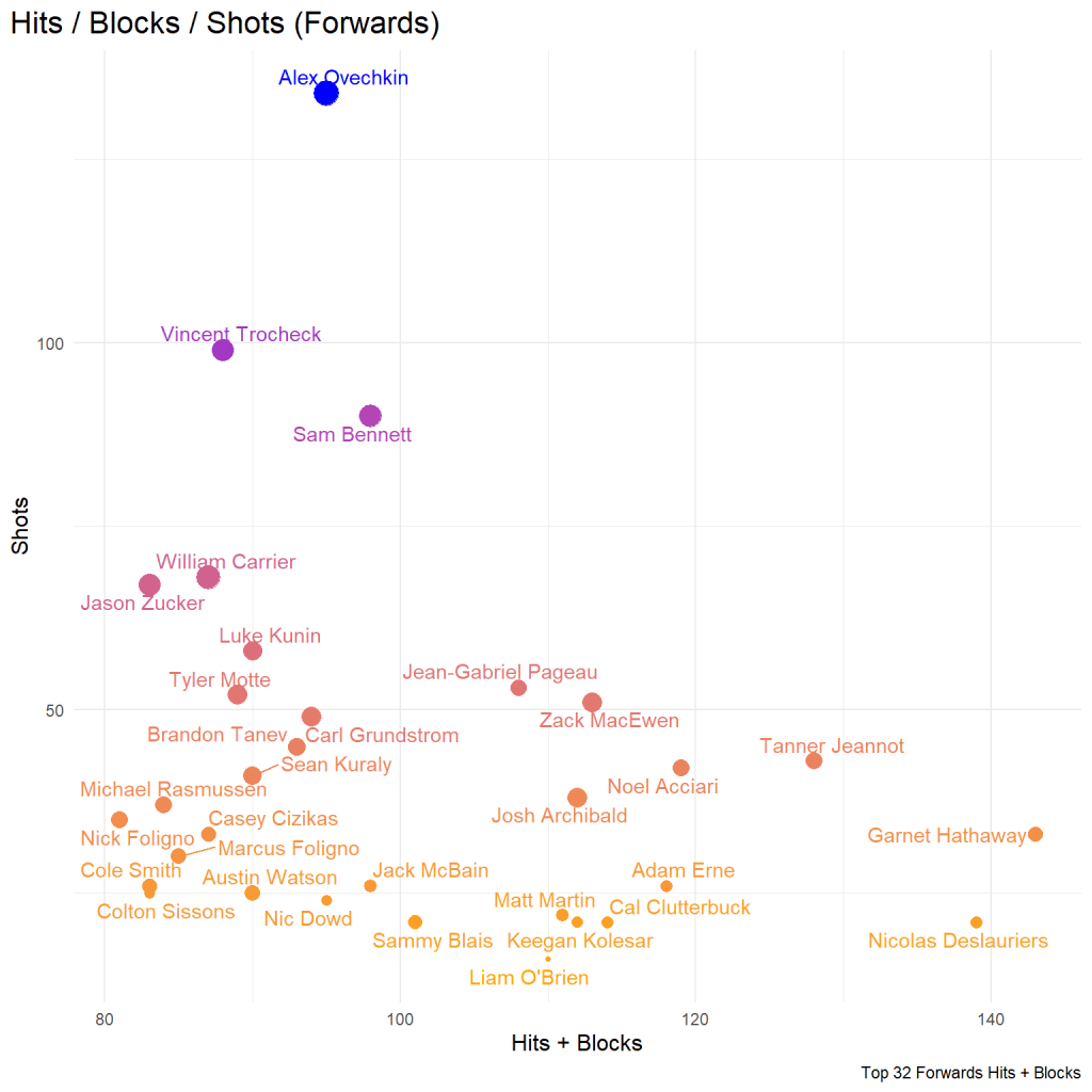 The plot below shows the forwards who have the most hits + blocks this season. The hits + blocks data is displayed on the x-axis, with the highest values appearing on the right side of the plot. The y-axis provides data about each skater’s shots, with the highest values rising to the top of the plot. The colour and size of each dot also provide information about the skater’s shots. The dots turn from orange to blue as they approach the top of the plot (i.e., more shots), and the dots go from small to big based on the skaters shots/60 (i.e., a bigger dot means a higher shots/60). So what does all that mean? The big blue/purple dots at the top of the plot represent the bangers who offer the most offensive benefits. A dot in the top right corner is a skater who does it all.