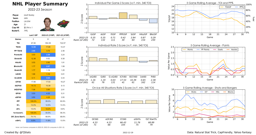 Matt Boldy is a very interesting case and a difficult one to boot. This is a player who scored 39 points in 47 games (68 point pace) last year averaging 15:22 of ice per game and has seen a big boost to 17:53 this year. However Boldy’s point pace has fallen off significantly on the season, down to a 58 point pace in his 31 games thus far. I do think there’s some room here for Boldy to increase his individual points percentage (IPP), currently below the league average for forwards at 55%. But his 12.5% shooting percentage (S%) and 11.8% on-ice shooting percentage (oiSH%) both feel very appropriate, so if there is to be some improvement in Boldy’s point production it feels like he just has to get more involved. Given that Boldy is playing down the lineup without a strong linemate to play off of, I can’t say I see huge upside for Boldy rest of season unless someone emerges to elevate Boldy the way Kevin Fiala did last year. I’ll put my chips in on a 60-65 point pace for Boldy rest of season, with some big hot streaks and long cold streaks mixed in along the way.