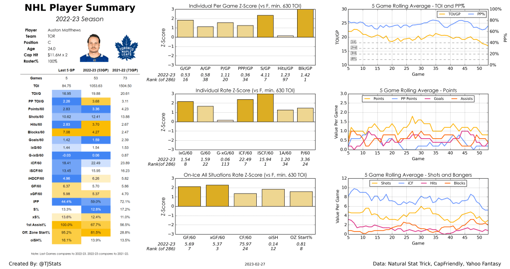 Secondly, I do believe Matthews is nursing an injury of some kind. He’s averaging just 16:58 of ice time over his past six games while registering a pedestrian (by his standards) 10.6 shots/60 and 12.4 iSCF/60. I can’t recall a stretch of games where coach Sheldon Keefe has given Matthews this little ice time before and it’s at least a little concerning. It’s pretty hard to bet against Matthews and if whatever’s ailing him is resolved soon then he could be absolutely dominant for the rest of the season. But the trend is enough to give me pause.