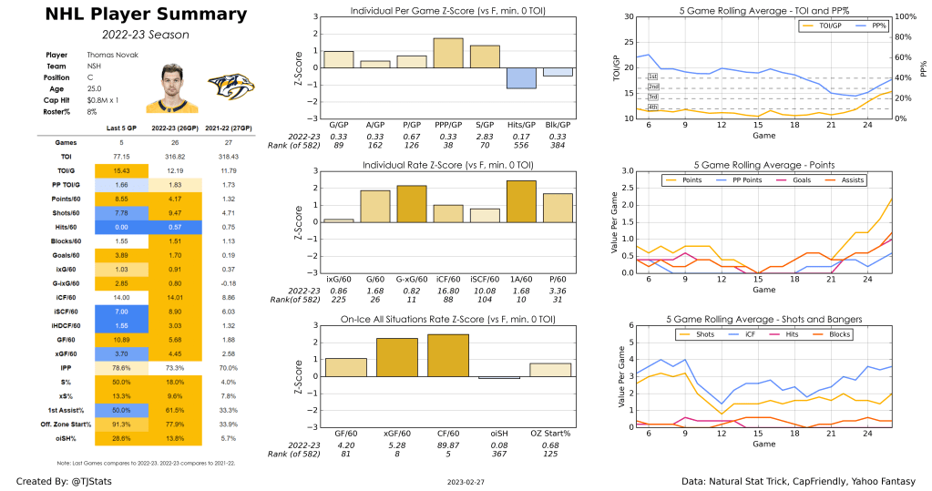 Overall it’s hard to say that Novak will continue to score at this rate without generating more shots, but he’s registered a very respectable 9.4 shots/60 and 8.9 iSCF/60 in 26 games this season. So go ahead and grab Novak if you’re looking for someone who’s hot at the moment, but keep that leash short and don’t get caught hanging on after he’s gone cold again.