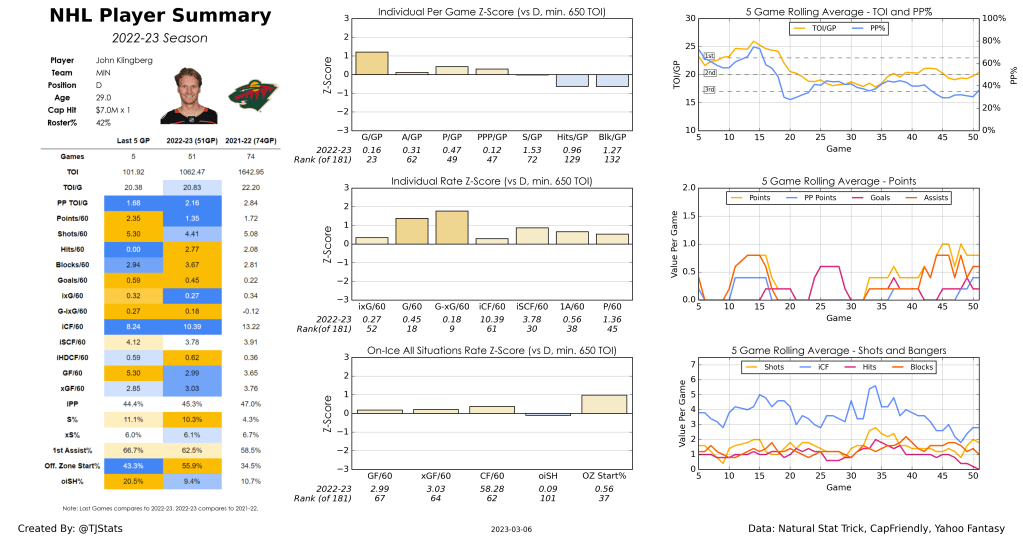 After a long and trying season in Anaheim, John Klingberg has a new lease on life as he tries to rehabilitate his free agent value in Minnesota. The Wild did not have to give up much to acquire him, but any team trading for Klingberg is quite obviously doing so with the singular purpose of having him run their top power play unit. Klingberg skated 19:40 including PP1 deployment in his first turn as a member of the Wild, and while he didn’t net any points it’s still an enviable role he’s inherited. Klingberg should be able to provide at least a 45-point pace for the rest of the season, and while he doesn’t provide much in the way of peripheral category coverage he’s a near lock to be significantly better than Calen Addison was for fantasy this year in the same role.