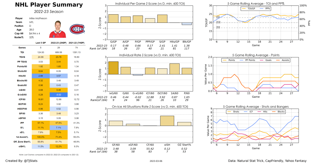 I’ve been high on Matheson ever since his trade to Montreal, and while it took a long time for the production to materialize due to various injuries, Matheson has been a stud over the last number of games. In fact, Matheson is tied for tenth amongst all defensemen with 11 points in 12 games since the All-Star break. He hasn’t changed much since his Pittsburgh days in terms of his advanced statistics, but he’s gone from averaging around 18:45 in Pittsburgh to 23:46 in Montreal and that five-minute boost has gone straight to his counting stats. Given his all-around contributions in shots, hits, and blocks in addition to his point potential, I view Matheson as a top-25 fantasy defenseman for the rest of the season at this point.