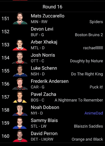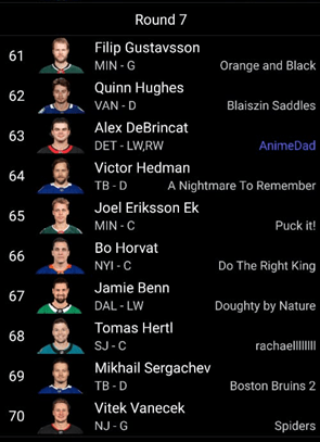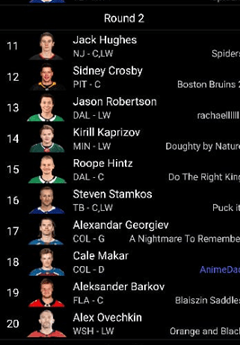 I honestly can’t believe Makar dropped to me at 18th overall, he was listed as DTD during this draft which is always sure to scare off your opponents. Personally, I love when that happens as you can be sure to find great value (see Brad Marchand from last year). Also, I’m not a fan of Roope this high, but it’s not the worst thing in the world. Outside of his great point production the dude kinda blows in bangers cats when taken this high as he doesn’t get many counting stats and barely wins any faceoffs despite being a C.