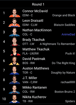 Now, without further ado, I’ll be going round-by-round and explaining my thoughts on these guys. This is a 10-person bangers cats league with G, A, PIM, PPP, SOG, FW, HIT, BLK, W, GAA, SV%, SHO. Positions are C, C, LW, RW, W, W, F, D, D, D, UTIL, UTIL. These positions are a little wonky but a ton of fun and very forgiving if you draft too many of one position, which I will get to below. Best player available is always the strategy with settings like these.