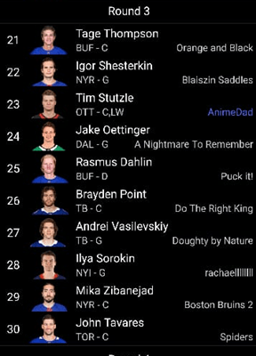 Goalies, goalies, goalies! I’m always elated when my opponents choose them early! Grabbing Timmy at 23 in bangers, I think is fair to good value, although in hindsight I think I would’ve preferred Petterson since Nate and Blake discussed a drop off in deployment for Stu in the “high risk high reward players” episode that was just released. Ah well, I think Stu will be a top 15 player with these league settings and will give me a lot more value than if I drafted a goalie! Also, holy moly with that Tage pick at 21. I’m wary of that guy’s top 10 ADP, but what a steal at 21!