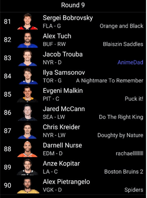Now this is where I’m totally cool grabbing goalies. I mean, I still won’t, but I think a guy like Samsonov at 84th is gonna be quite the steal. Dude is going to be a volume starter on possibly a team that could easily make a case for the president’s trophy. I went for Trouba here because I felt very confident in my point scoring ability to this point and wanted to really shore up the bangers cats. Steal of this round has got to be Alex Tuch though, bravo, good sir. He’s going to continue where he left off last year with 30+ goals and a PPG pace on a team that’s only getting better.