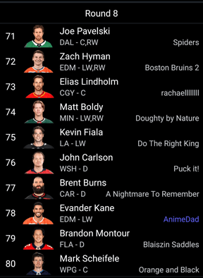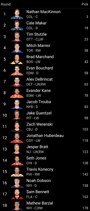 And with my final pick, I got Matthew Barzal! Now that the Islanders have Horvat to take care of draws and defensive responsibilities, I really think Barzal will shine and score some serious points. I know that’s laughable given his track record on the island, but as my last-round pick, this is nothing but high ceiling with no risk at all. His RW dual eligibility gives him tons of value compared to other years where he was just a C, so I’m more than happy with this as my last pick.