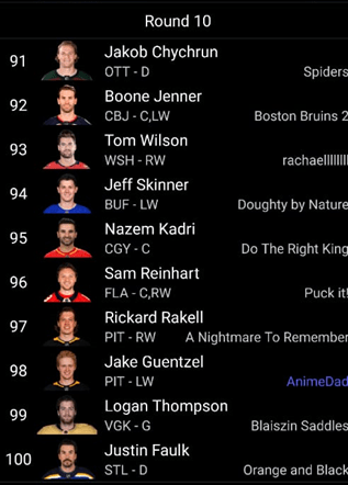 This is kind of insane, as Jake Guentzel should be taken closer to the 4th round if this was a league with fellow A&G listeners. I kept passing him because, again, I was very satisfied with my point scorers, but I just couldn’t bear to let the guy run past me in the 10th round! I think too many people are scared off from his ankle injury, not realizing that he’s going to be good to go come November. You really gotta keep an eye on who is DTD/IR when you draft and plan ahead on where you want to snag them; these players almost always end up being nothing but value with very little risk as they have a whole season to come back! The only time this backfired on me was Landeskog last year, and even then I would say the draft capital spent was worth the risk.