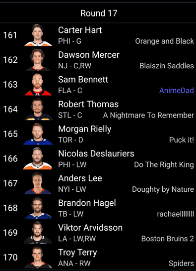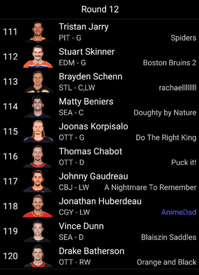 Zach Werenski to someone who actually has a decent understanding of fantasy, however, is a 5th round value! The dude shoots like an incel at his high school reunion and scores a healthy number of goals for a defenseman. Use this to your advantage! If you draft with casual players, this guy is almost always going to drop to you in the mid to later rounds. At this point of the draft, I have waaaaayyy too many defensemen, but there’s no way I’m not drafting the best player available as, again, this league has 2 utility spots, and even if I don’t have room for him, the dude will be a blue-chip trade piece within the first month of the season. BOOK IT.